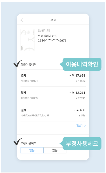 사진과 같이 트래블월렛 앱 >> 마이 >> 카드관리 메뉴에서 분실신고를 합니다. 우선 최근 카드 이용내역을 확인하여 본인이 쓰지 않은 내역을 찾아봅니다. 불행히도 다른이가 사용한 내역이 있다면 사진처럼 부정 사용 여부를 ‘있음’으로 체크합니다.