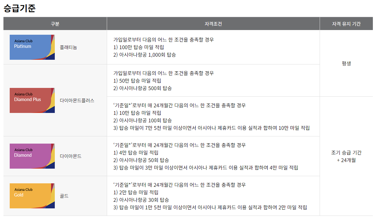아시아나 클럽은 골드 회원 이상을 우수회원으로 분류하여 관리합니다. 등급은 맨 위에서부터 플래티늄, 다이아몬드플러스, 다이아몬드, 골드 등급으로 구분됩니다. 이중 다이아몬드 플러스와 플래티늄은 평생 등급이 유지되고 혜택을 받으실 수 있습니다. 승급 기준 유지를 위해서 기준일 혹은 본인의 가입일을 반드시 파악해야 하는데요. 2008년 9월 30일 이전 가입회원은 매 짝수년도 11월 1일이 기준일이 되구요. 2008년 10월 1일 이후 가입한 경우에는 회원 가입일이 기준일이 됩니다. 여기서 정말 중요한 내용은 회원 등급이 변동되는 경우에 재설정된 일자를 기준일로 하여 24개월간의 탑승 혹은 아시아나 제휴카 이용 실적으로 등급을 결정합니다.
